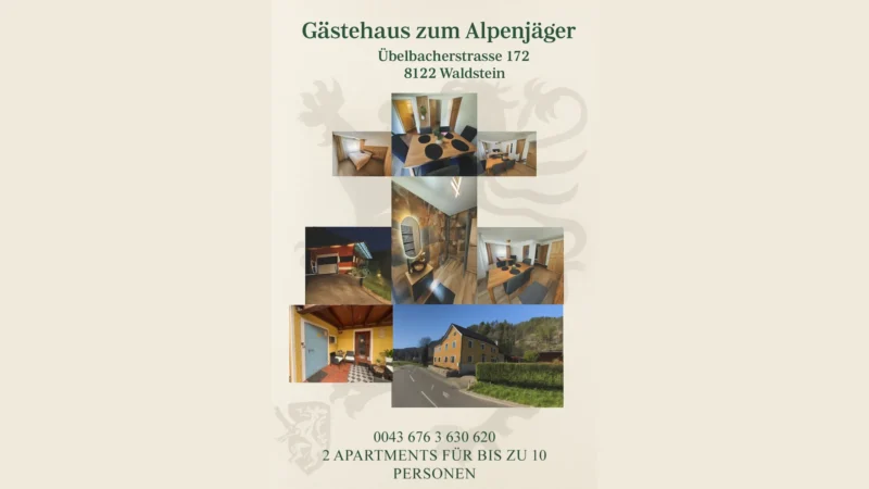 Hier siehst du eines der ersten Projekte von ImZenox.EU: das Werbeplakat für das Gästehaus zum Alpenjäger in Waldstein. Klare Typografie, warme Naturtöne und eine Bildcollage zeigen die Apartments und fassen alle wichtigen Infos – Adresse, Kapazität und Kontakt – auf einen Blick zusammen.